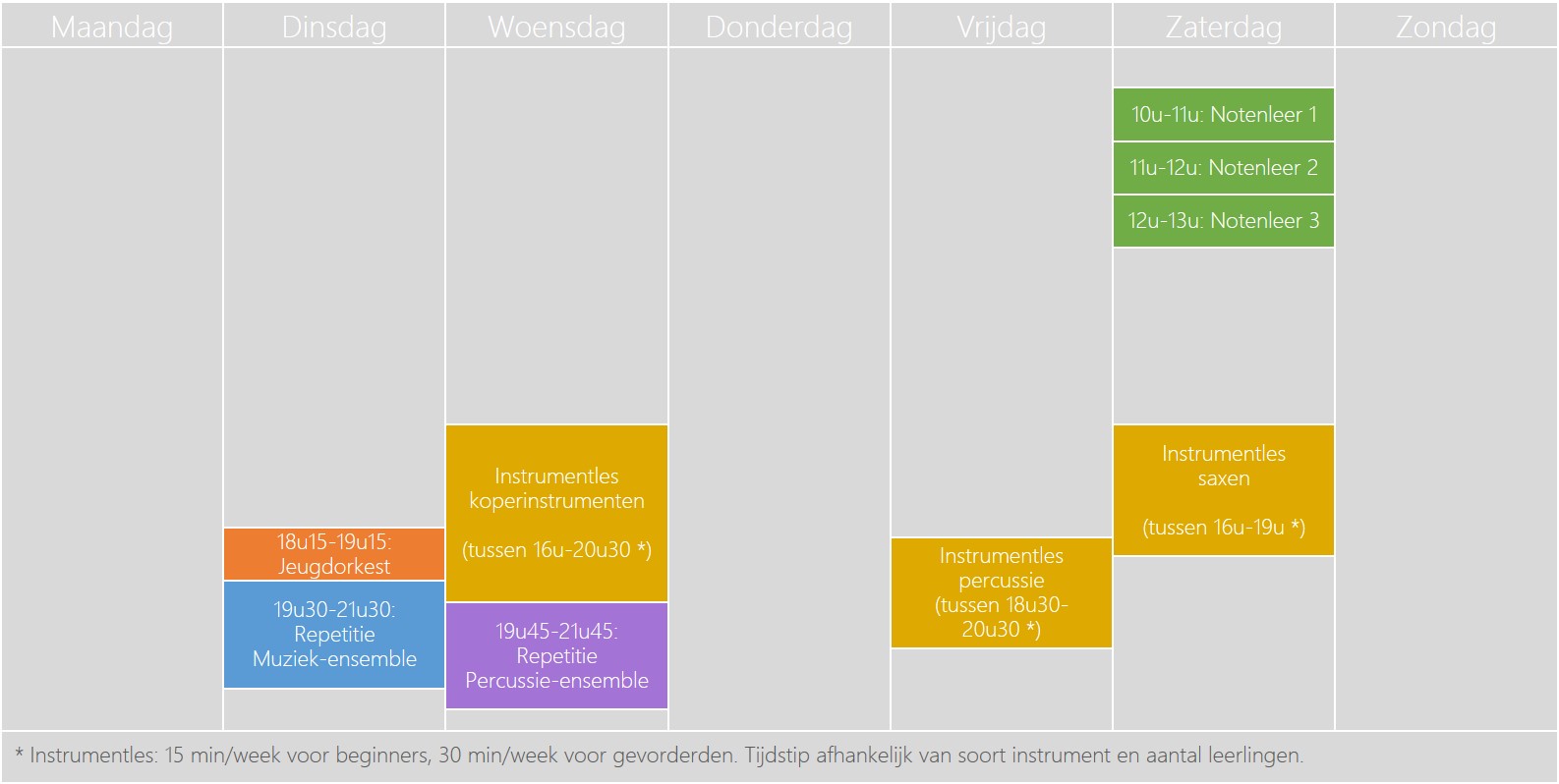 - Instrumentles: individuele instrumentles (15min/week voor beginners, 30min/week voor gevorderden) (vanaf 2e semester 1e lesjaar)